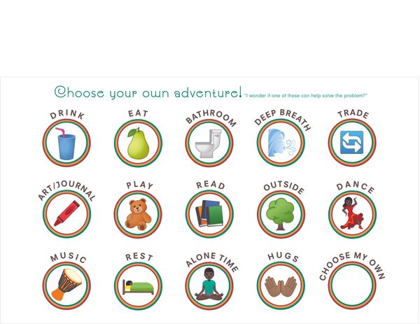 Introduce your children to the fun of playing the Problem Solving Game. The game board starts with a song that teaches children how to play. The Problem Solving Game board lays out the Action Steps. For each Action Step a “Mantra”, “Adult Support Tip” & “My Needs” tip is included. When children are in crisis, this is the go to game that will help return them to calm.