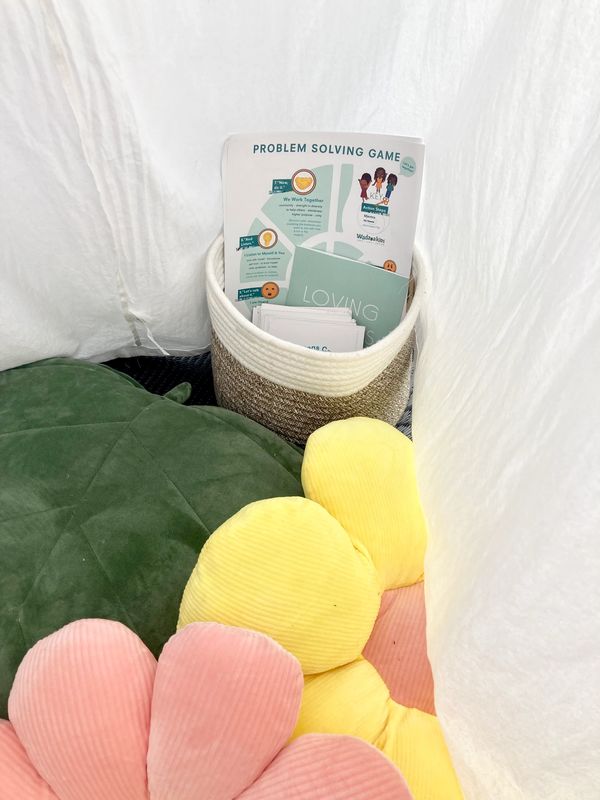 Set up an inviting “Cozy Corner”. The Problem Solving (made easy) Kit comes with the “Step by Step Set Up Guide” which includes an online training video on how to set up the “Cozy Corner” & how to play the Problem Solving Game. You can adapt these guides to best suit the needs of your home, classroom or child care center.